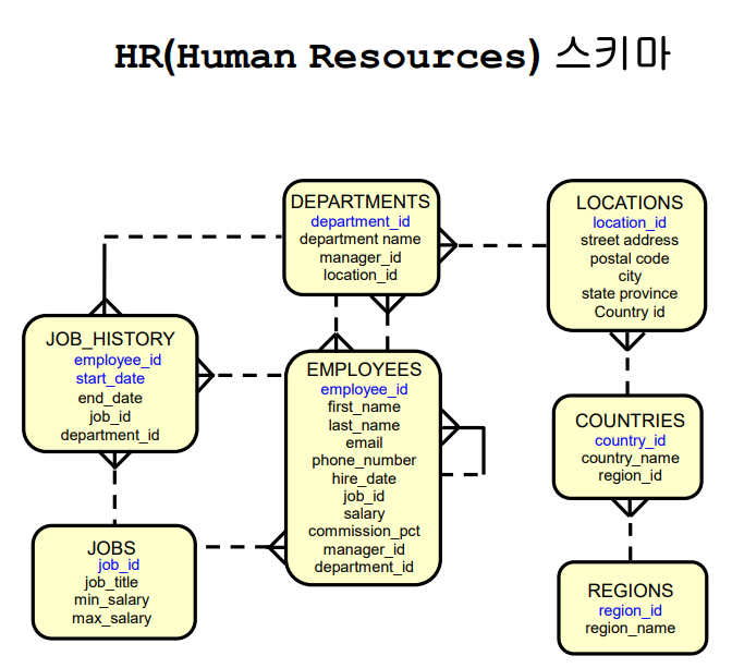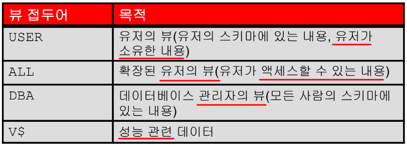 데이터 딕셔너리 DB를 효율적으로 관리하기 위한 다양한 정보를 저장하는 시스템 테이블 사용자가 테이블을 생성하거나 변경 할 때 자동으로 갱신된다. 사용자는 DATA 딕셔너리의 내용을 직접 수정/삭제가 불가능 하다. 데이터베이스의 구조 정보 즉 메타 데이터를 담고 있다. 데이터 딕셔너리는 DB를 구성하는 모든 요소에 대한 정보를 가지고있다. 오라클 사용자의 정보 오라클 권한과 롤 정보 데이터베이스 스키마 객체(TABLE,VIEW,INDEX,CLUSTER,SYNONYM,SQUENCE...)정보 무결성 제약조건에 관한 정보 오라클 데이터베이스의 함수 와 프로시져 및 트리거에 대한 정보 기타 일반적인 DATABASE정보 딕셔너리 정보 보기 SELECT * FROM DICTIONARY; ALL_XXX 한 특정 사..